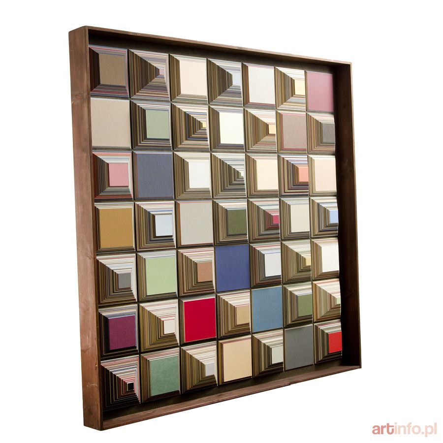 relief, sklejka/płyta pilśniowa, 122 x 122 cm (wraz z oprawą autorską) sygnowany, datowany i opisany na odwrociu: `Andrzej Urbanowicz | ,,Trzy kwadraty Wenus" | 2004 oraz znak autorski`