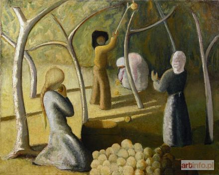 Olej, płótno; 75 x 92 cm Na blejtramie nalepka pisana na maszynie: "203 Baake Bolesław | 1. Kobieta na stołku 94,5 x 71,5 | 2. Praca w sadzie 71,5 x 94,5" Na odwrocie malowana olejno (niedokończona) postać kobiety siedzącej na stołku