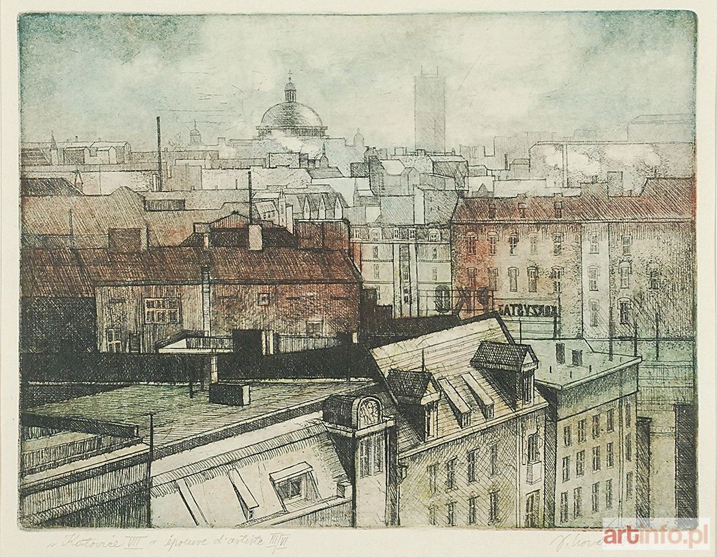 akwaforta, akwatinta, papier, 24,7 x 32,3 cm (odcisk płyty), 27,9 x 34 cm (w świetle oprawy); sygn. i dat. p. d.: J. Nowak 1984 (ołówkiem), opis l. d.: "Katowice VIII" - epreure d' artiste IIII/IV;