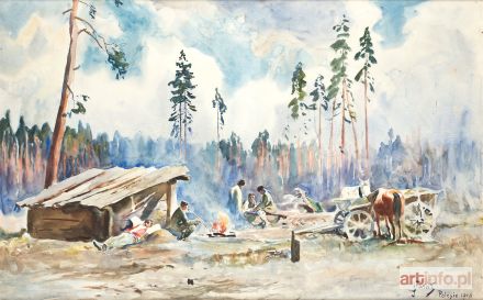 akwarela, papier naklejony na płótno, 65 x 107 cm sygn. l.d.: jFałat/Polesie/1916 na odwrocie nalepka z Muzeum Narodowego w Krakowie z opisem i numerem inwentarzowym