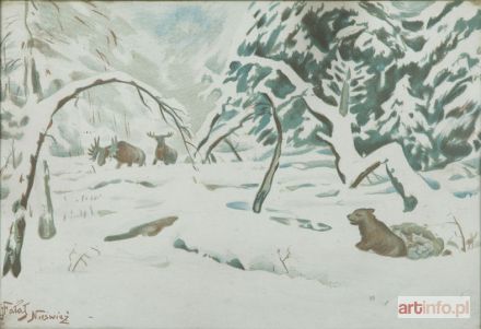 litografia barwna/papier, 28 x 42 cm sygnowana na kamieniu l.d.: 'J Fałat Nieśwież' Praca pochodzi z teki "I Teka myśliwska - łosie i niedźwiedzie. 8 autolitografii barwnych" Toruń 1919-1920. Wydawnictwo artystyczne "Sztuka"