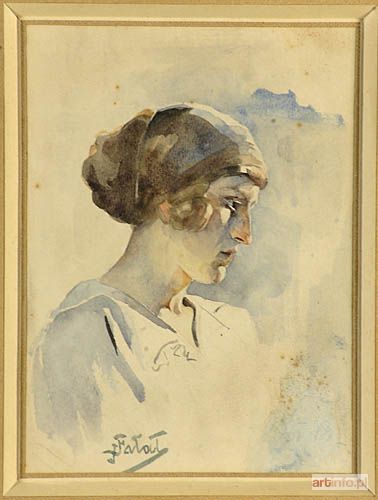 Julian Fałat, malarz, akwarelista i pedagog. Studia malarskie, rozpoczęte w 1869 w krakowskiej Szkole Sztuk Pięknych, a kontynuowane w Akademii Sztuk Pięknych w Monachium w pracowniach A. Strähubera i J. L. Raaba, ukończył ostatecznie - pokonując ograniczenia i wszelkie trudności wynikające z chłopskiego pochodzenia i wiążącego się z nim statusu materialnego - w 1882 w swej macierzystej uczelni, która po latach (1895-1909) powołała go na swego rektora, którą zreformował i - po apodyktycznych rządach Matejki - skutecznie zmodernizował. Jego talent rysowniczy i ilustratorski, oczywisty już w półamatorskich pracach z okresu, gdy - jako dokumentalista oraz mierniczy - pracował na Ukrainie (w okolicach Humania i w Odessie) oraz w Szwajcarii, eksplodował podczas przedsięwziętej w 1885 podróży dookoła świata. Przełomowe znaczenie dla jego kariery miały akwarele rejestrujące przebieg słynnych polowań, organizowanych w Nieświeżu przez Antoniego Radziwiłła (1886, i liczne, późniejsze repliki), które znalazły uznanie w oczach dostojnego gościa księcia - ordynata: Wilhelma ks. Pruskiego (przyszłego cesarza Wilhelma II). Zaproszony przezeń do Berlina, Fałat na prawie dziesięć lat związał się z dworem pruskim, antycypując w tamtejszym środowisku późniejszy sukces W. Kossaka. W niepodległej Polsce, po przejściu na emeryturę, osiadł w swej posiadłości w Bystrej na Śląsku, do końca swych dni utwierdzając swą pozycję najbieglejszego pod względem warsztatowym polskiego pejzażysty wypowiadającego się w technice akwarelowej. Prezentowana akwarela - nastrojowy, pełen uroku portret, malowany nader swobodnie, a zarazem niezwykle subtelnie powstała naszym zdaniem, sądząc po cechach formalnych i sposobie sygnowania, w drugiej dekadzie XX w. (omal na pewno po 1909) i wydaje się przynależeć do grupy intymnych, w żadnej mierze niekomercyjnych, przedstawień rodziny artysty względnie osób z grona jego najbliższych przyjaciół. Możliwe, że do handlu antykwarycznego szybko jednak trafił, może być bowiem tożsamy ze Studium głowy, które w 1930 znajdowało się w krakowskim Salonie Sztuki Horowitza (por.: Wystawa dzieł Juliana Fałata w Katowicach, Związek Artystów Plastyków na Śląsku, jesień 1930 roku, poz. 43, s. 11).