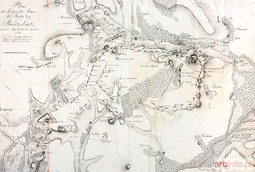 Plan bitwy pod Bolesławicami (20 VIII – 12 IX 1761); anonim, pochodzi z: Lloyd, gen. Henry, Geschichte des siebenjahrigen Krieges in Deutschland..., tom V, wyd. Johann Friedrich Unger, Berlin 1794; miedz. cz.-b., odbity z 2 płyt, st. bdb., ślady wielokrotnych złożeń książkowych; wymiary mapy: 837x568; Plan / des Lagers der Armee / des Königs bey / Buntzelwitz / vom 20ten. Augt. bis den 12ten. September / 1761...;