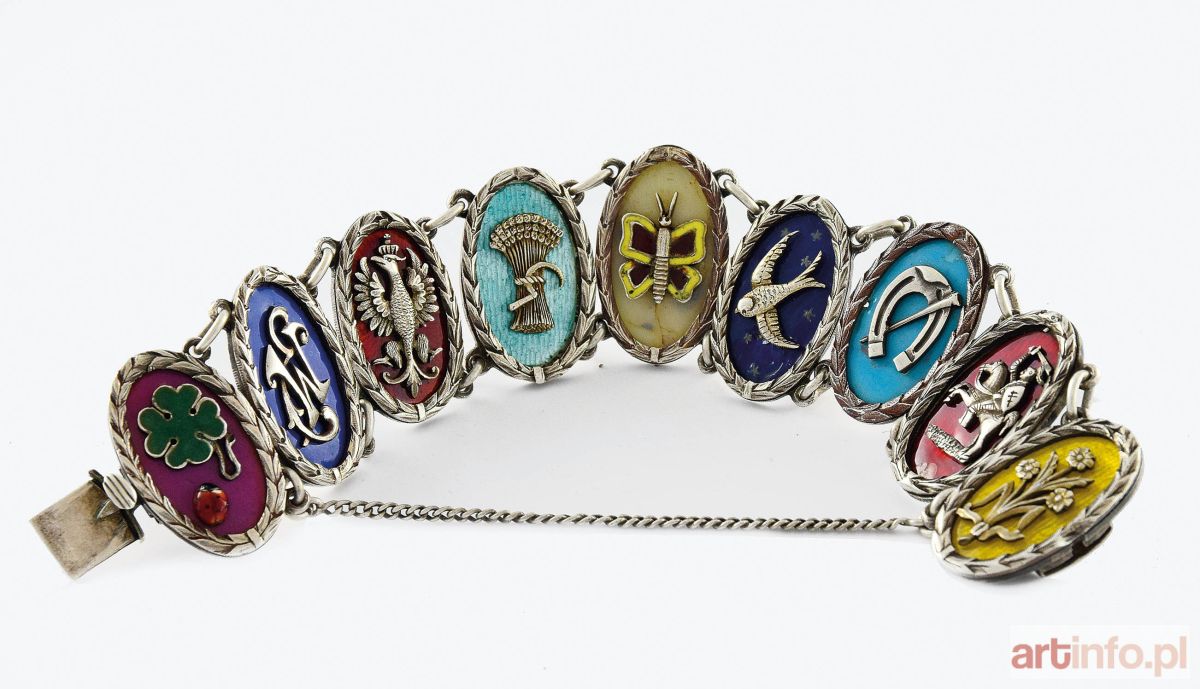 Bransoleta wykonana ze srebra bez próby, składająca się z 9 owalnych ogniw opasanych gałązkami lauru. Ogniwa ozdobione kolejno: 4-listną koniczynką z zieloną emalią i czerwoną biedronką na czerwonym tle; monogramem wiązanym „EW” nałożonym na tło szafirowe; Orłem w koronie na tle czerwonym; snopem i sierpem, z zielono-niebieską emalią na giloszu; motylkiem białoczerwonym na emalii perłowej; jaskółką - na tle kobaltowym z gwiazdkami; podkową i hufnalem na emalii w kolorze morskiego błękitu; litewskim herbem Pogoń - z czerwoną emalią na giloszu; gałązką o trzech kwiatkach, przewiązaną wstążką, z żółtym, giloszowanym tłem. Bransoletka z zabezpieczającym łańcuszkiem; wykonana zapewne na zamówienie dla młodej dziewczyny o inicjałach „EW” - z ziemiańskiej rodziny, o czym świadczyć mogą patriotyczne symbole - Orzeł i Pogoń -połączone z emblematami życia wiejskiego (snopek, końska podkowa etc.).