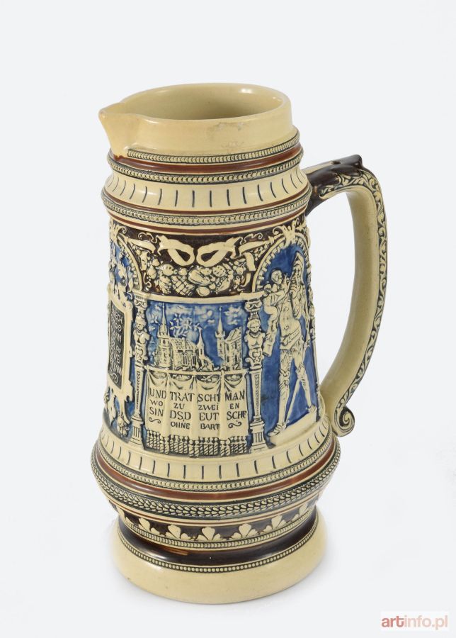 fajans szkliwiony, farby ceramiczne; wys. 29 cm, średn. 14 cm; na spodzie wycisk: 116. Z reliefowym wzorem ze scenkami rodzajowymi z przysłowiami niemieckimi; z uchwytem C-kształtnym; brak nakrywy. Niemcy, XX w.
