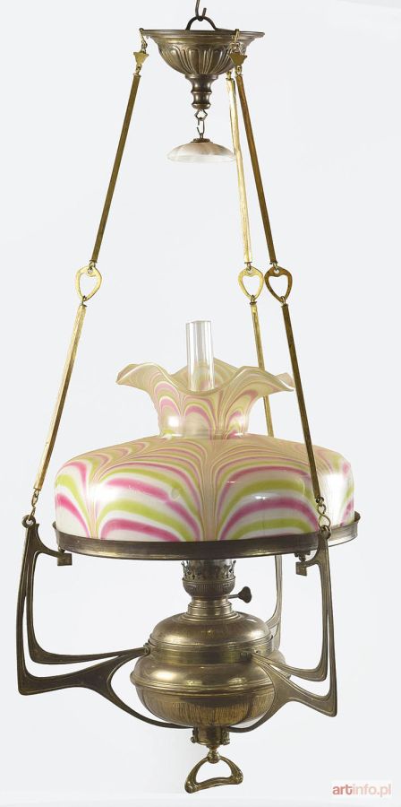 Lampa naftowa, wisząca, secesyjna mosiądz, szkło, porcelana; wys. 107,5 cm, średnica obręczy 41,5 cm, średnica klosza 39,5 cm, wys. ca 22,5 cm. Niemcy, Neheim a. d. Ruhr, XIX/XX w.