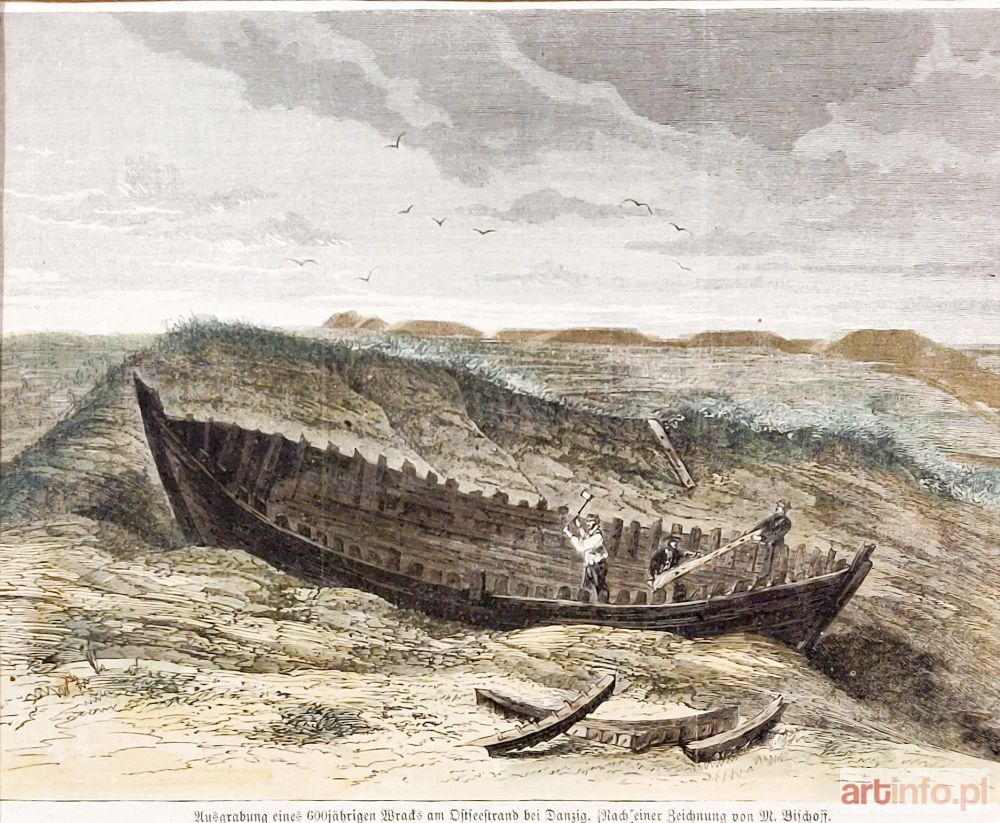 Wydobycie 600-letniego wraku łodzi na gdańskiej plaży, rys. M. Bischoff, 1873; drzew. szt. kolor., st. bdb., passe-partout; wymiary widoku: 233x169 mm; Ausgrabung eines 600jähringen Wracks am Ostseestrand bei Danzig;