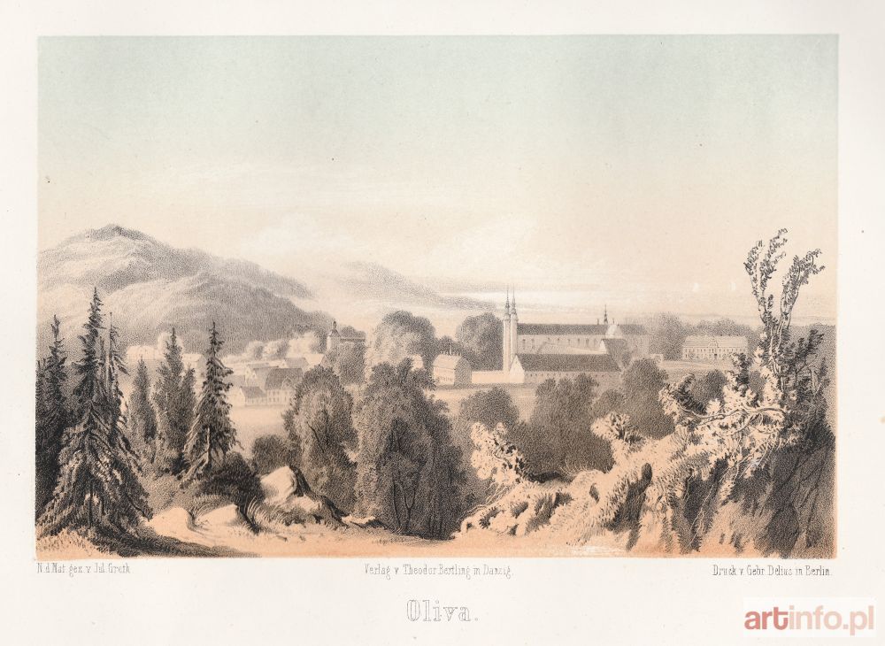 Panorama Oliwy, rys. i lit. Julius Greth, odbili bracia Delius w Berlinie, wyd. Theodor Bertling, Gdańsk, ok. 1860; chromolit., st. bdb., minimalne zażółcenia krawędzi, niewielkie żółtawe plamki na lewym marginesie; wymiary widoku: 197x129 mm; Oliva; RZADKIE!