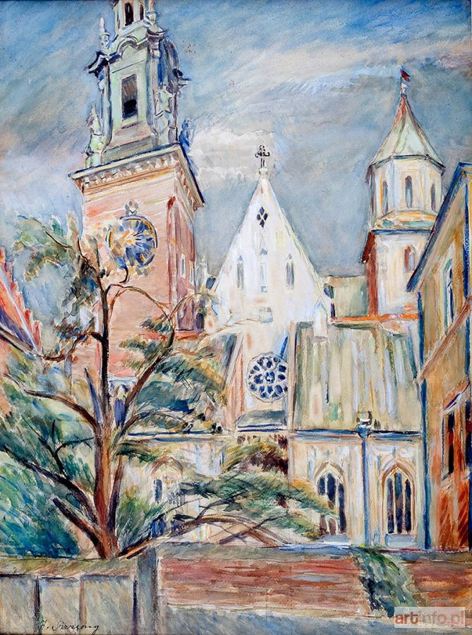 Kościół akwarela, ołówek, papier, 63 × 47 cm w świetle ramy sygn. l. d.: J.Szczęsny na odwrocie nalepka: SZKLARNIA/FR.MAĆKOWIAK/POZNAŃ/KRASZEWSKIEGO14/OPRAWAOBRAZÓW
