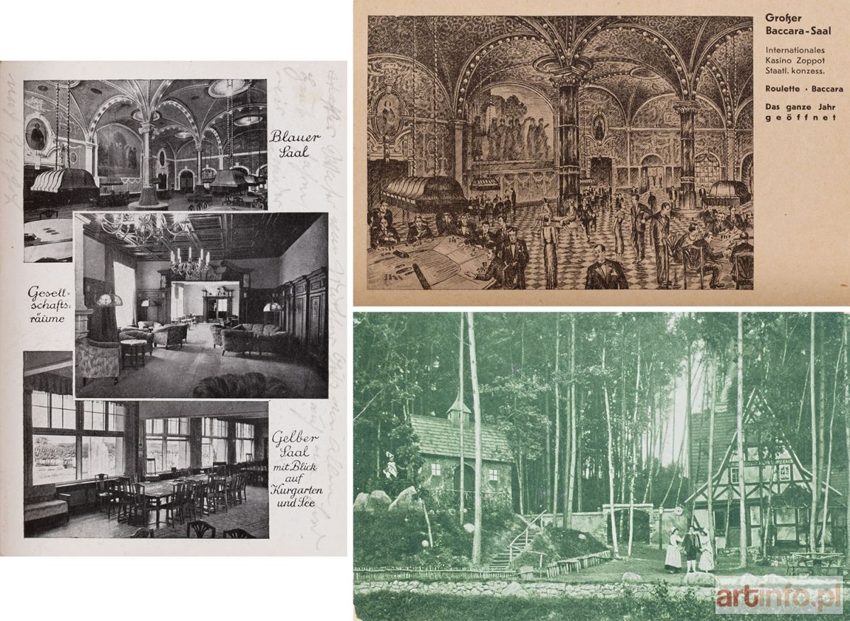 1. Wnętrze Kasyna w Sopocie; druk: A. W. Kafemann, Gdańsk, 14,9 x 10,4 cm, z obiegu 2. Przedstawienie "Złoty Krzyż" Ryszarda Wagnera w Operze Leśnej w Sopocie, ok. 1912 r., zdjęcie z 1910 r., Carl Bäcker, Gdańsk, 9,2 x 14,7 cm, bez obiegu 3. Sala do gry w bakarata w Kasynie w Sopocie; wyd. A. W. Kafemann, Gdańsk, 8,9 x 14,1 cm, bez obiegu