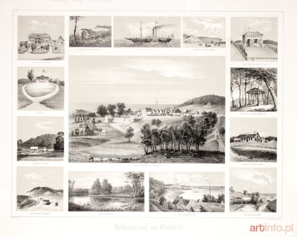 Widoki miasta i okolic w 14 sekcjach, lit. Sukkert, druk. L. Sachse & Co., Berlin, ok. 1850; widoki przedstawiają: 1) Haupt-Ansicht von Misdroy; 2) Das deutsche Haus; 3) Bellevue; 4) Försterei Latzig; 5) Strand und Caffeberg; 6) Der Jordan See; 7) Der Vietziger See; 8) Strasse in Lebbin; 9) Das Gesellschaftshaus; 10) Pavillon auf dem Caffeberge; 11) Das Philipsborn'sche Haus; 12) Spitzberg u. Düringshöh; 13) bez tyt.; 14) Schlucht am Caffeberge; lit. tonowana, st. bdb., minimalne uszkodzenie prawego dolnego narożnika; wymiary: 400x305 mm; Erinnerung an Misdroi;