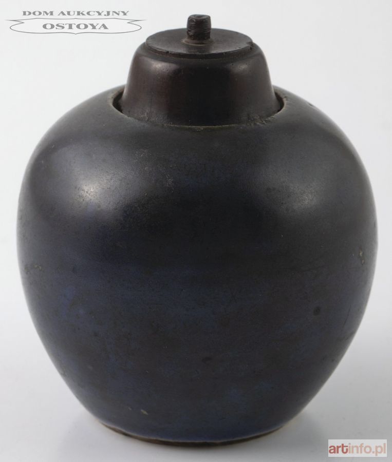 Porcelana, niebieska polewa, wys. 8, śr. 9 cm, drewniana zatyczka Stan: na brzuścu wybrzuszenie i wypałowy ubytek polewy Pochodzenie: ze zbiorów kompozytora Zygmunta Mycielskiego, potem redaktora Czytelnika Stanisława Kołodziejczyka