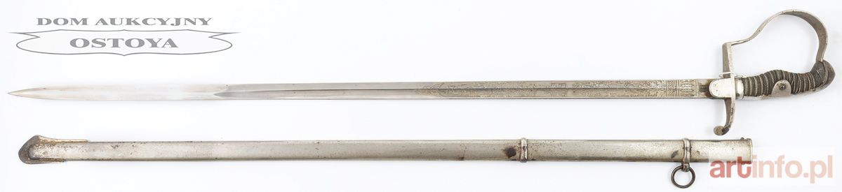 Stal, niklowanie, drewno, skóra (jaszczur), dł. całk. W pochwie 98 cm, bez pochwy 96,5 cm, głowni 84 cm Głownia trawiona : panoplia i godło Danii; u nasady na zewnętrznym płazie: Seifert & Nørgaard / Kjøbenhavn; na wewnętrznym: głowa króla i rycerza nad literami: W K & C