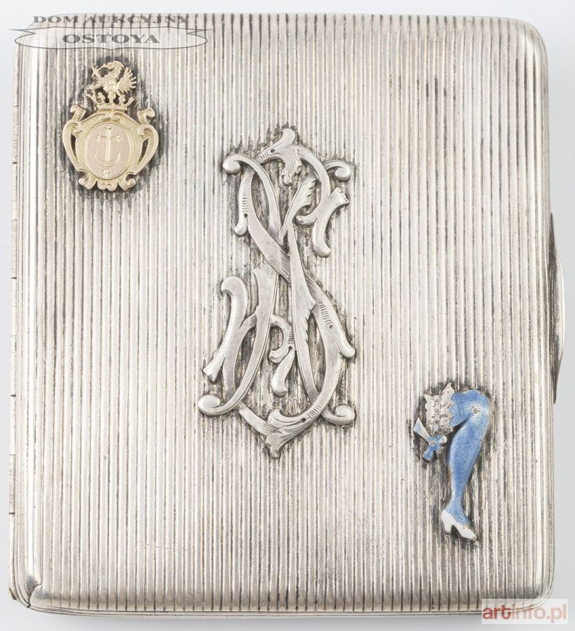 Srebro, próba 0,916, waga 166,2 g; 10,5 x 9,5 x 1,3 cm Wewnątrz złocona, na wieczku trzy aplikacje: złoty (pr.0,560) herb Murdelio, monogram SK; kobieca noga (z niebieską i biała emalią)