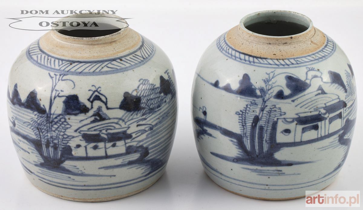 Porcelana, kobalt podszkliwny, wys. 17, śr. 17 cm Stan, brak pokrywek, jedno naczynie z włosowym pęknięciem Pochodzenie: ze zbiorów kompozytora Zygmunta Mycielskiego, potem redaktora Czytelnika Stanisława Kołodziejczyka
