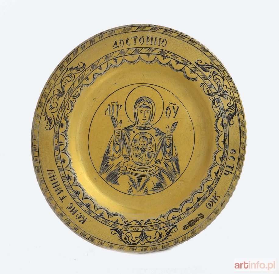 W formie okrągłego talerzyka, z grawerowanym wizerunkiem Matki Boskiej z popiersiem Chrystusa na płaszczu, na kołnierzu napisy cyrylicą
