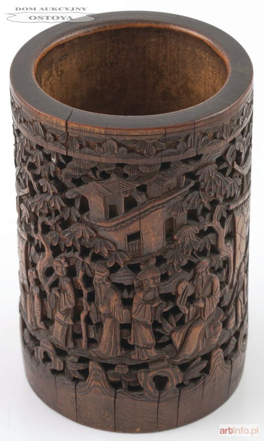 Bambus, relief, wys. 16 , śr. 10 cm Przedstawiona scena figuralna w ogrodzie, paw, dwa jelonki i napisy ideogramami chińskimi Pochodzenie: ze zbiorów kompozytora Zygmunta Mycielskiego, potem redaktora Czytelnika Stanisława Kołodziejczyka