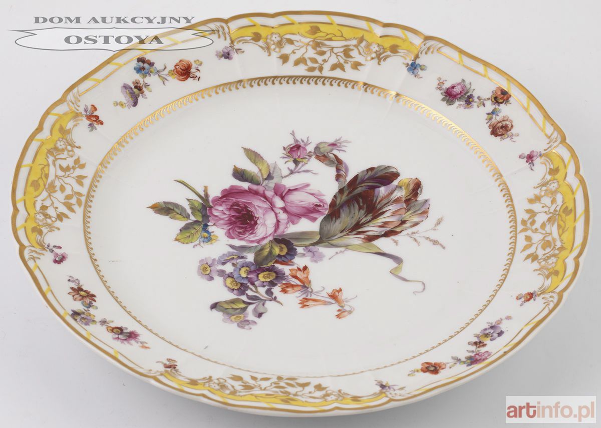 Model: Żółty Serwis Fryderyka Wielkiego dla Zamku Poczdamskiego, 1771 Porcelana, farby naszkliwne, złocenia; śr. 35 cm Sygnowany kobaltem podszkliwnie: berło; czerwonym drukiem: jabłko królewskie nad literami KPM; wyciskiem: 1 D X; czarną farbą 13/16