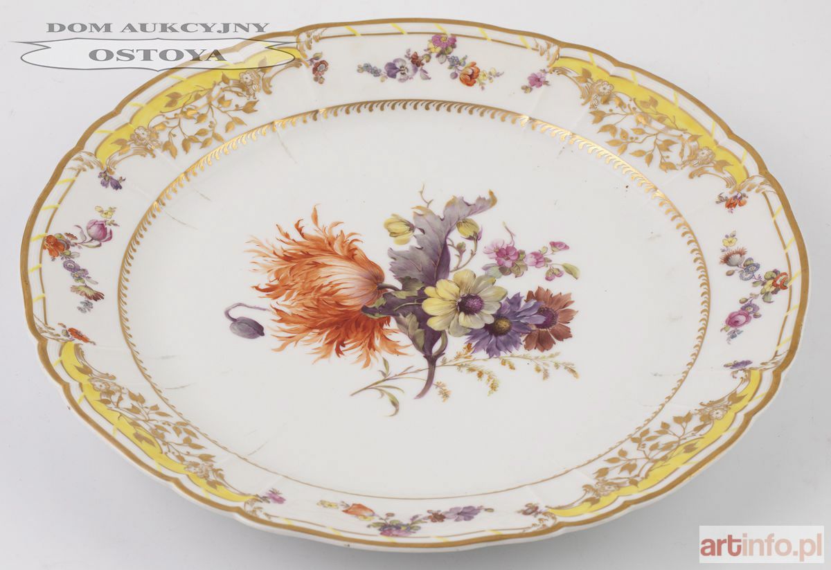 Model: Żółty Serwis Fryderyka Wielkiego dla Zamku Poczdamskiego, 1771 Porcelana, farby naszkliwne, złocenia; śr. 35 cm Sygnowany kobaltem podszkliwnie: berło; czerwonym drukiem: jabłko królewskie nad literami KPM; wyciskiem: 3 l V; czarną farbą 13/16; 52