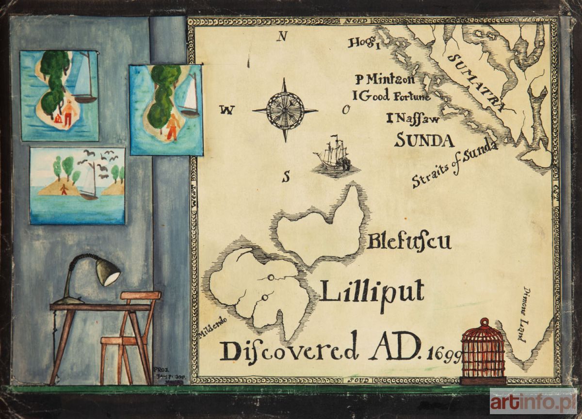 gwasz, tusz/papier, 23 x 31,4 cm sygnowany i datowany l.d.: ‘proj. | JAN PYJOR | (nieczytelne)/73’, opisany na odwrociu: ‘Jerzy Broszkiewicz | „Dwie Przygody Lemuela Guliwera” | Skala: 1: 20. | PROJ. JAN PYJOR’ Teatr Ziemi Pomorskiej, Grudziądz, reż. Jan Pyjor