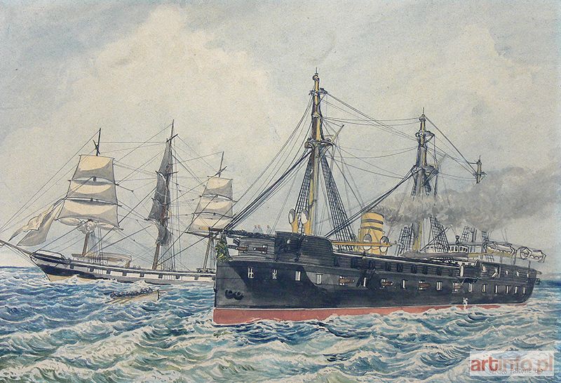 akwarela, papier, 24,5 x 36,5 cm sygn. p. d.: Matteo Falcone Na odwrocie nalepka z napisem: Le Fregate cuirasse „La Couronne” arraisonnant le clipir Americain ”Golden Rule” Mer du Nord Aout 1870 au large d’Heligoland (Opancerzona fregata „La Couronne” zatrzymuje amerykański kliper „Golden Rule” Morze Północne, sierpień 1870)