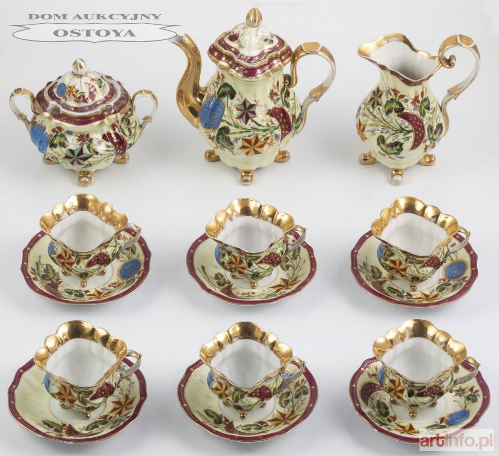 Porcelana, farby naszkliwne, złocenia, w składzie: sześć filiżanek (wys. 7,5, śr. spodka 15 cm), dzbanek (23 cm), mlecznik (19 cm), cukiernica (15,5 cm)