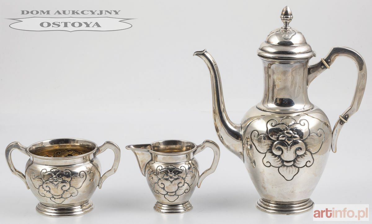 Srebro, próba 826, mlecznik i cukiernica wewnątrz złocone, kość (izolatorki), waga całk. 777 g, wys. 29, 9,5, 9,5 cm Puncowanie: trzy wieże z datą 16, monogram probierza Christiana F. Heise CFH, monogram złotnika PTA