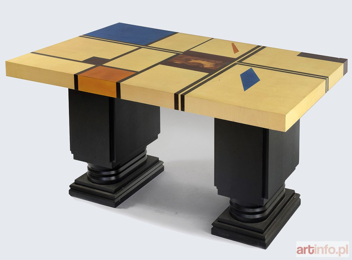 Stół - biurko z prostokątnym grubym blatem, poprzecinanym siatką czernionych wstęg tworzących na powierzchni i bokach prostokątne pola wypełnione w rożnych kolorach kremowym, niebieskim i brązowym, a pośrodku intarsjowanym wzorzystym orzechem, wsparty na dwóch masywnych czernionych szafkowych podporach w głównej części prostopadłościennych, podciętych u dołu na schodkowych platformach.