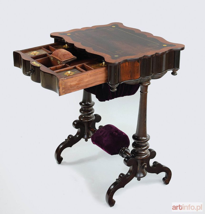 Stolik do robótek o falistym blacie, z szufladką i workiem przypiętym do jej dna, służącym do przechowywania większych robótek, wsparty na wysmukłych, toczonych podporach, rozwidlonych w faliste dwójnogi i spiętych tralkową łączyną z poduszeczką dla stóp pośrodku. Blat oraz wieka pojemników i igielnika z wewnętrznymi szufladkami (4 pojemniczki, 1 igielnik, 5 przegródek) intarsjowane. Stolik do przechowywania robótek, o dekoracyjnym kształcie i uzupełniającej jego ozdobność intarsji, z workiem pod szufladą - rzadziej spotykanym - do przechowywania większych robótek (np. tamborka).