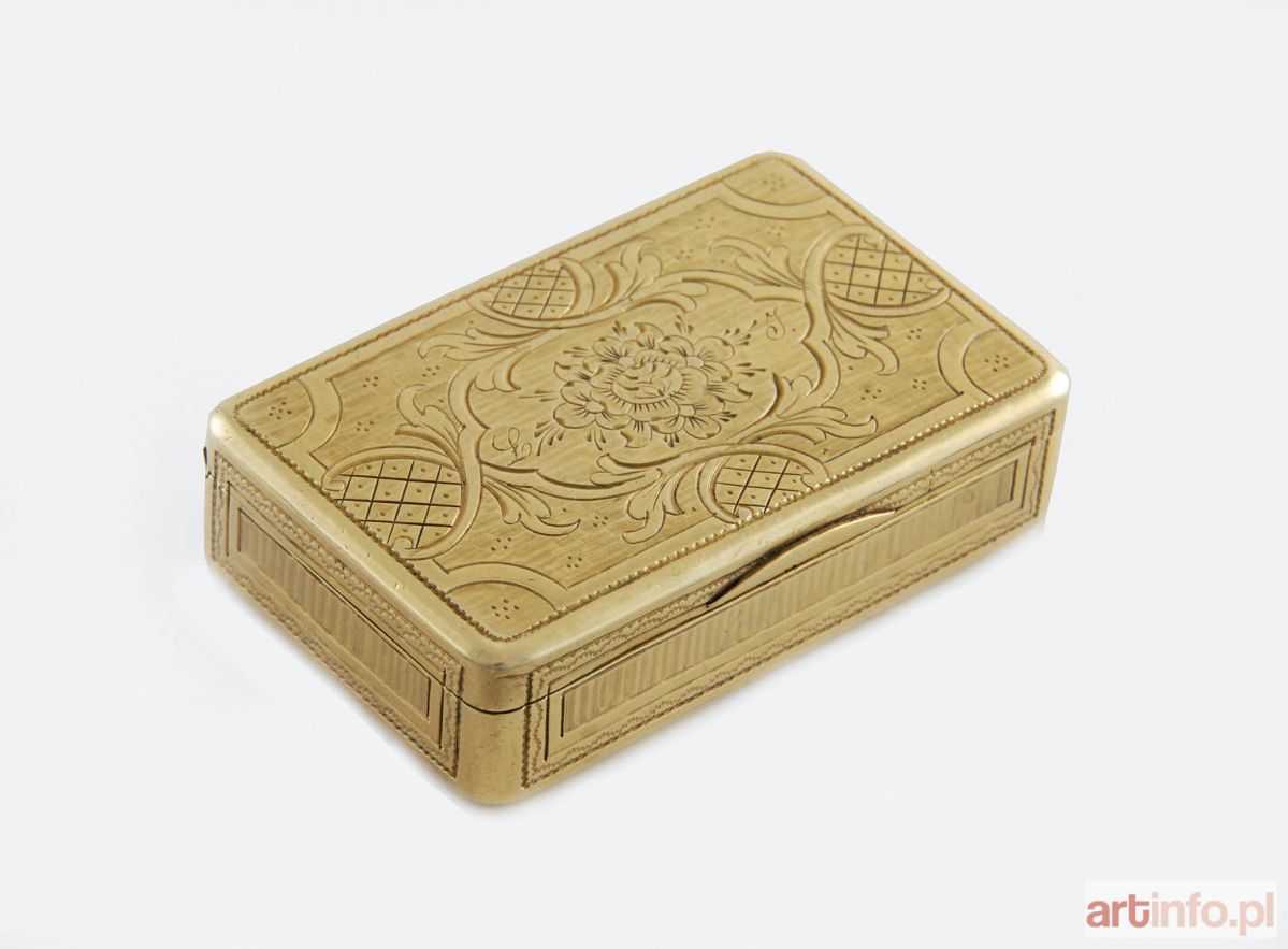 Ozdobiona na wieczku i spodzie grawerowanym kwiatem w wielolistnej rezerwie oraz ornamentem taśmowym z wkomponowaną kratką, na wieczku monogram ŁJ