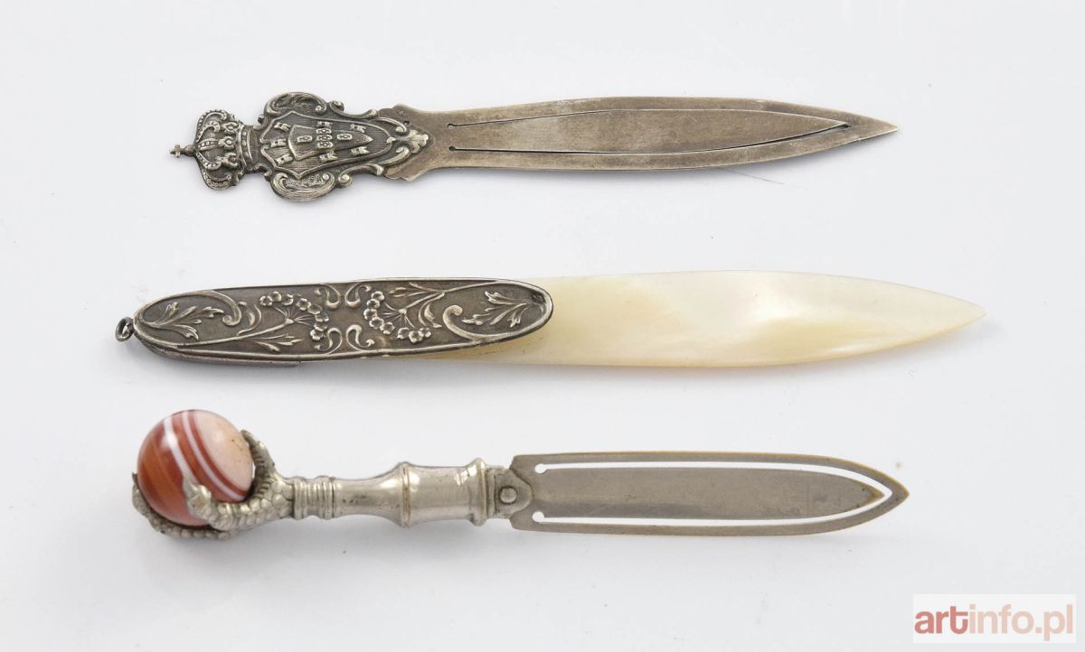 1/ lancetowata , z uchwytem zakończonym szponami ptaka trzymającymi kulę agatową; plater, agat; dł. 10 cm 2/ lancetowata, z uchwytem ozdobionym kartuszem z herbem pod koroną; srebro niecechowane; dł. 10 cm 3/ lancetowata z masy perłowej, oprawiona w srebro dekorowane motywem floralnym; srebro niecechowane, masa perłowa; dł. 12 cm Europa Zach., k. XIX i XX w.