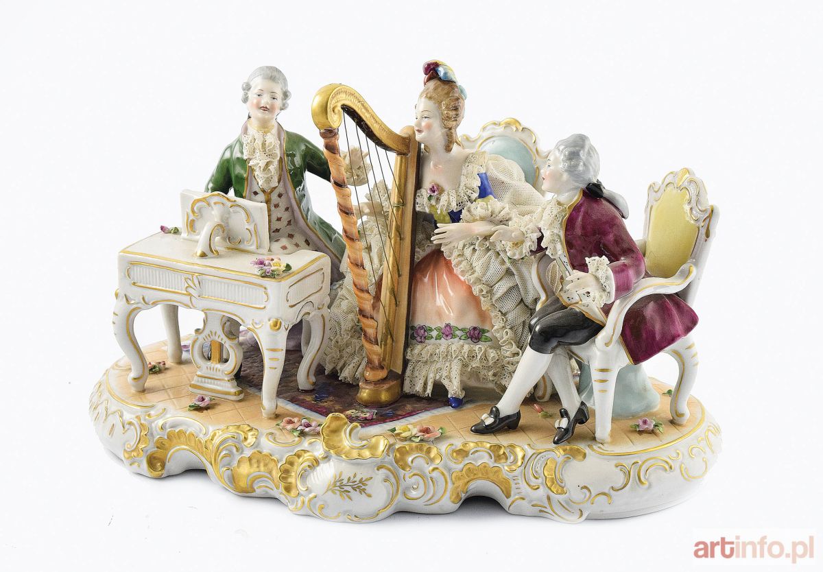 Grupa figuralna - muzykujący porcelana, farb naszkliwne, złocenia; ubytki ceramicznych koronek w strojach (żaboty, mankiety, falbanki sukni); wys. 23,5 cm, podstawa 36,5 x 23 cm; sygn. od spodku niebieskim drukiem na biskwicie: stylizowana czasza kielicha zwieńczona 3-dzielną koroną, niżej pod koroną i w czaszy: VEB/ UNTER/ WEISS/ BACH, niżej półkoliście Germany. Niemcy, VEB Porzellanfabrik w Unterweissbach (Turyngia), lata ok. 1950-1970