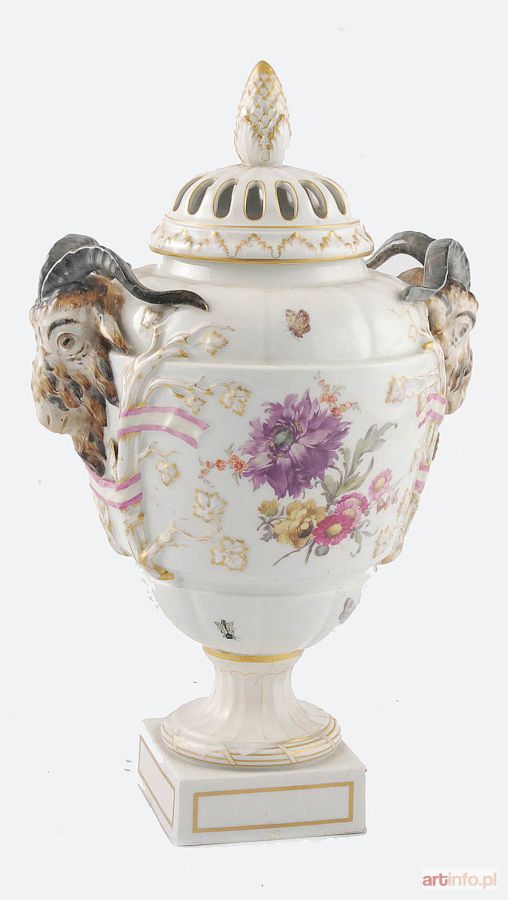 W formie amfory z ażurową pokrywą z uchwytem - wydłużoną szyszką akantowa, na szpulowej stopce z kwadratową plinta; uchwyty w formie plastycznych baranich główek, umieszczonych pomiędzy reliefowymi dwiema gałązkami winorośli z przeplecioną wstążką; z dwu stron na brzuścu barwne kompozycje kwiatowe: 1) z różą, fioletowymi prymulkami i kielichowym żółtym kwiatem, 2) z fioletową chryzantemą i różowym kwiatem; ponadto barwne motylki i owady; lekkie przetarcia złoceń brzusiec montowany ze stopą na plincie na metalowy trzpień;