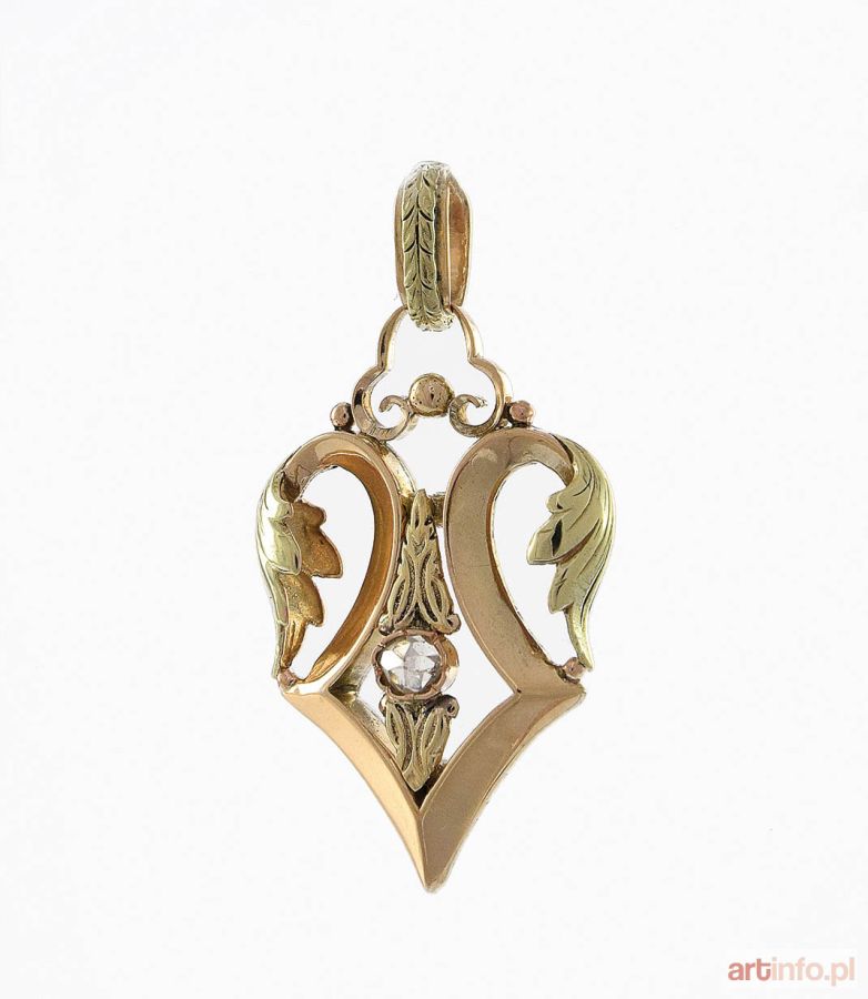 podłużna kompozycja z motywami roślinnymi, w centrum owalna rozeta diamentowa o masie ok. 0.18 ct (VS/E-G), złoto pr.ok.0.500, masa całkowita 5.065 g. Wyrób został wykonany we Francji, XIX/XX w.