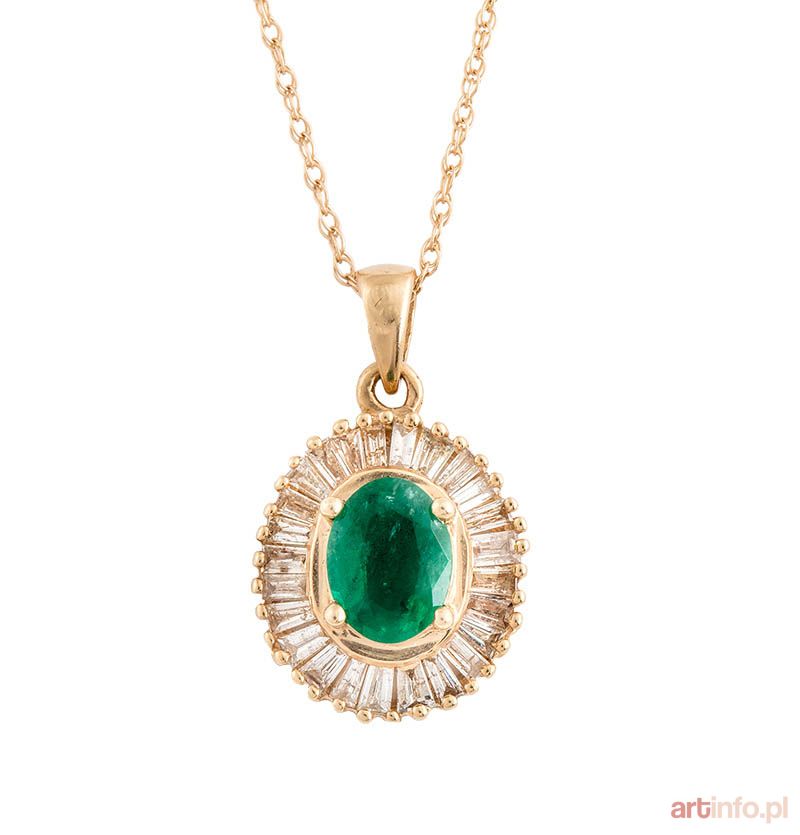 złoto pr. ok. 0,585, m. 4,08 g, diamenty: 25 szt. łącznie ok. 1,00 ct, P/L-N, prostokątne i trapezowe bagiety, szmaragd ok. 1,00 ct, owal, szlif fasetowy mieszany, dł. łańcuszka: 47 cm, wisiorek: 2,3 × 1,5 cm