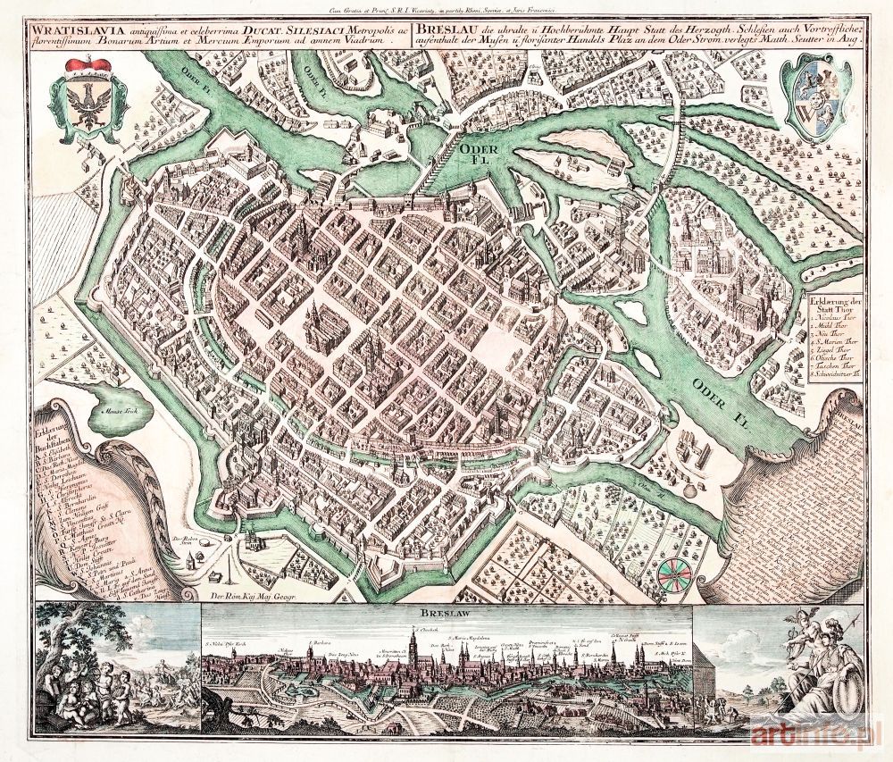 Perspektywiczny plan miasta, wyd. Matthäus Seutter, Augsburg, ok. 1740, drugi wariant efektownego dzieła Seuttera (pierwszy wyd. ok. 1730, w drugim dorytowano tekst przywileju i tytuł Geografa Cesarskiego); w dole panorama miasta (tyt.: BRESLAW) oraz dwie alegoryczne sceny; miedz. kolor., st. bdb., passe-partout, ślady naddarć i zagnieceń, uzupełniony nieznaczny ubytek papieru na dolnym marginesie; wymiary płyty: ok. 585x505 mm; tyt. w górze: WRATISLAVIA antiquissima et celeberrima...; / BRESLAU die uhralte...; [Von Stettin... 30, Imago Silesiae... 251, Ikonografia Wrocławia 37]