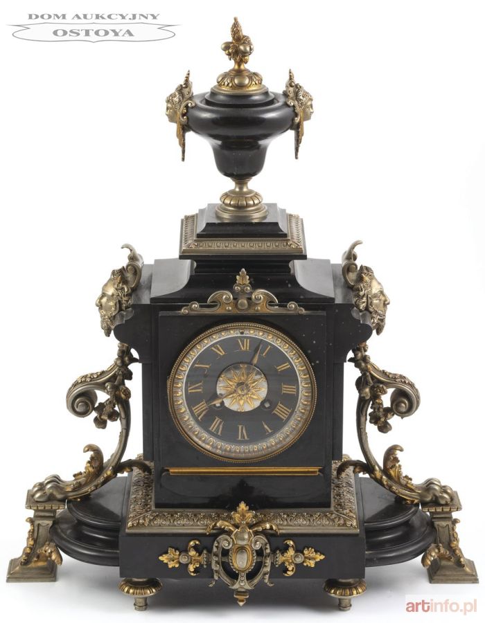 Obudowa czarny marmur, aplikacje: biały metal patynowany, złocony, wys. 46 cm; mechanizm o naciągu sprężynowym z regulatorem wahadłowym, systemem bicia godzin i półgodzin Sygnowany: Medaille de Bronze, S. Marti et Cie; 275