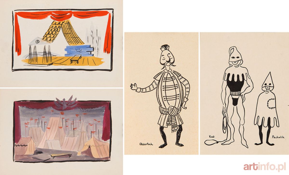 akwarela/papier; tusz/papier,w skład zestawu wchodzą dwa projekty scenografii, jeden dwustronny (16 x 23 cm), oraz dwa projekty kostiumów: "Obżartuch (22 x 15,5 cm) oraz "Kat i Pacholik" (21 x 15 cm) Teatr Polski w Bydgoszczy, Aleksander Fredro, reż. Jacek Gruca