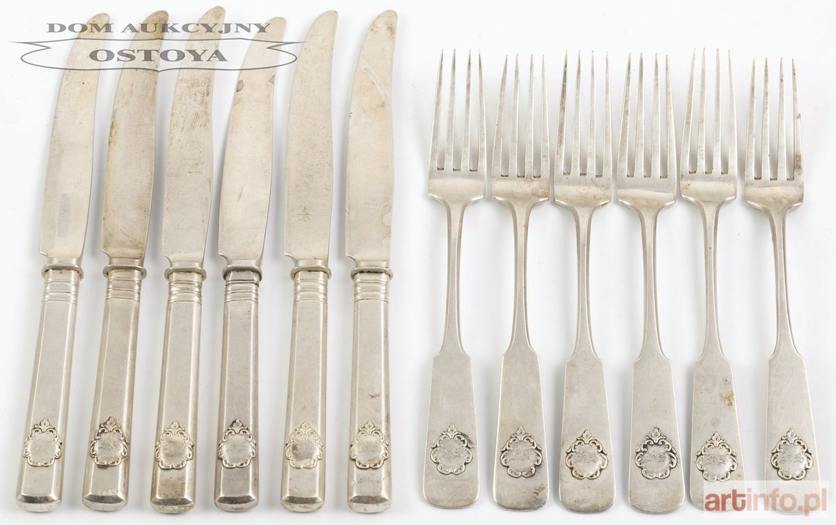 Po 6 noży i widelców, srebro, waga 583 g, dł.18 i 21,5 cm Puncowanie: Br.Hempel, na widelcach: półksiężyc z trzema gwiazdami, 84, głowa w kokoszniku, AB, na nożach: ι, głowa w kokoszniku, 84 Wyryty monogram JS Ze srebrnymi ostrzami - rzadkość