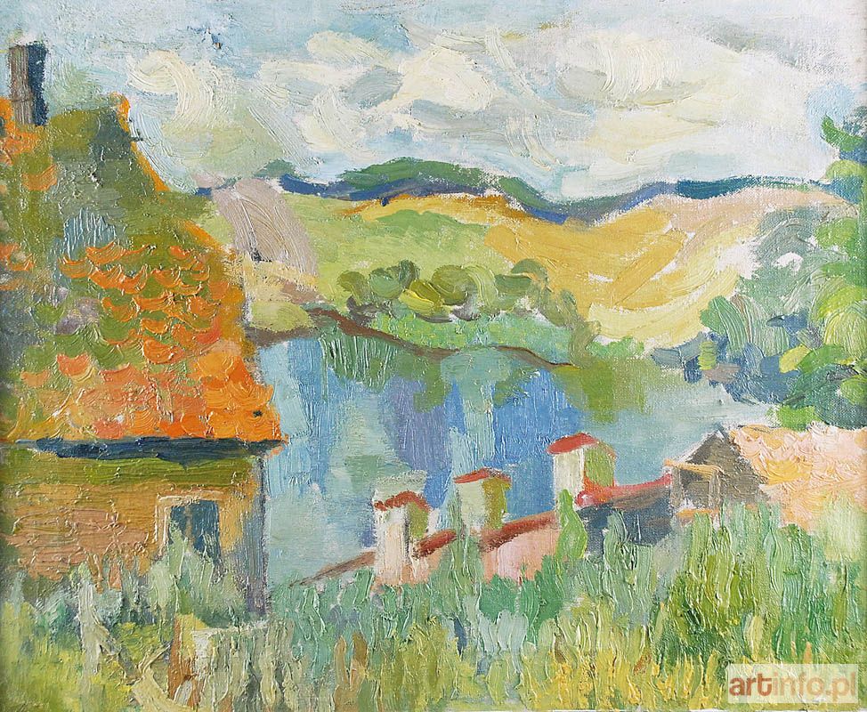 Na odwrocie napis: Konrad Swiniarski - Pejzaż, ok 1949,powstał podczas pleneru, w ktorym uczestniczył/Swiniarski organizowanym przez Wł. Strzemińskiego / zakup od Jerzego Machiewicza, wystawiony w 1948 r. w Galerii Sztuki Wspołczesnej / Anny Wesołowskiej / w Łodzi "wyst."Profesorowie i absolwenci PWSSP w Łodzi w latach 1945-53" Praca publikowana w katalogu: "Profesorowie i absolwenci PWSSP w Łodzi w latach 1945-1953" 28 kwietnia - 12 maja 1984 r. Galeria Sztuki Współczesnej Anny Wesołowskiej w Łodzi