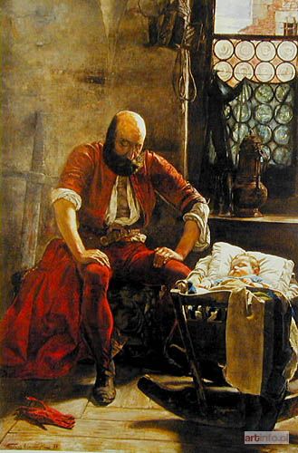 Znany dotychczas tylko z literatury obraz Nad kolebką był pokazany po raz pierwszy na wystawie w Paryżu w roku 1889. Artysta został wówczas nagrodzony listem pochwalnym. W tym samym roku obraz mogła również obejrzeć publiczność warszawska w Towarzystwie Zachęty Sztuk Pięknych. Ponownie obraz był zaprezentowany w Zachęcie rok później.