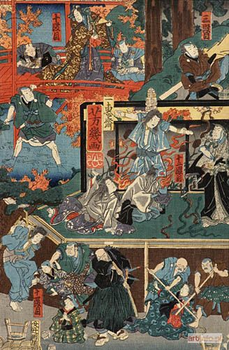 (fragment większej kompozycji) drzeworyt barwny nishiki-e, format oban-tate-e, 36 x 23,5 cm sygnatura: Yoshiiku ga stempel cenzora: aratame stempel z datą: 7 miesiąc roku Smoka
