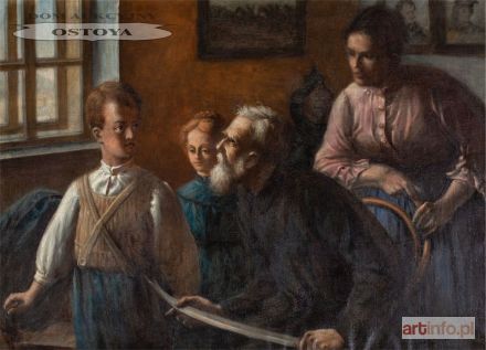 Obraz przedstawia starca - weterana, powstań narodowych z szablą w ręku, uczącego wnuków patriotyzmu. Na ścianach wiszą portrety bohaterów narodowych: Józefa Poniatowskiego i Kościuszki oraz przedstawienie patrolu powstańczego