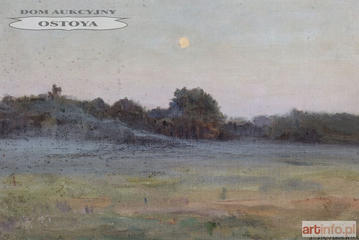 Olej, płótno naklejone na tekturę; 24 x 37 cm Sygnowany p.d.: St.Straszkiewicz Na odwrocie papierowa, drukowana, wypełniona piórem nalepka:z opisem pracy: 14306 Autor Ś+P Straszkiewicz Stanisław / Tytuł Motyw wieczorny / Cena Własność Data nadesłania III 1926 Obraz eksponowany na wystawie pośmiertnej artysty w 1926 r w TZSP w Warszawie