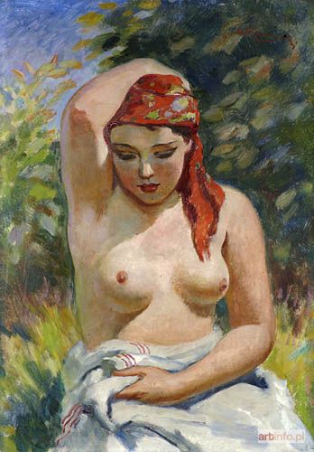 Prezentowany obraz to spotykane w twórczości Żurawskiego ujęcie postaci półnagiej kobiety na tle przyrody. Kobieta w czerwonej chuście lewą ręką podtrzymuje tkaninę, którą owinięta jest w pasie, prawą unosi i sięga za głowę. Obraz odznacza się charakterystyczną dla prac tego artysty żywą kolorystyką i swobodnym modelunkiem.