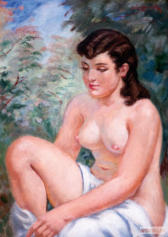 Stanisław Żurawski uczył się w latach 1907-13 w krakowskiej Akademii Sztuk Pięknych u Józefa Mehoffera i Wojciecha Weissa. W trakcie studiów wielokrotnie otrzymywał nagrody i medale za swoje prace szkolne. Był członkiem i współzałożycielem Cechu Artystów Plastyków "Jednoróg", z którym w latach 1925-32 stale wystawiał swoje obrazy. Malował portrety, kompozycje figuralne, martwe natury i pejzaże. Najczęściej jednak tworzył akty i półakty kobiece przedstawiane bąd¼ to w plenerze, bąd¼ na tle barwnych, dekoracyjnych tkanin, makat, pościeli i poduszek. W obrazach tych widać wyra¼ne inspiracje sztuką nauczyciela akademickiego artysty - Wojciecha Weissa. Prezentowany obraz to spotykane w twórczości Żurawskiego ujęcie postaci półnagiej kobiety. Obraz odznacza się charakterystyczną dla prac tego artysty żywą kolorystyką i swobodnym modelunkiem.