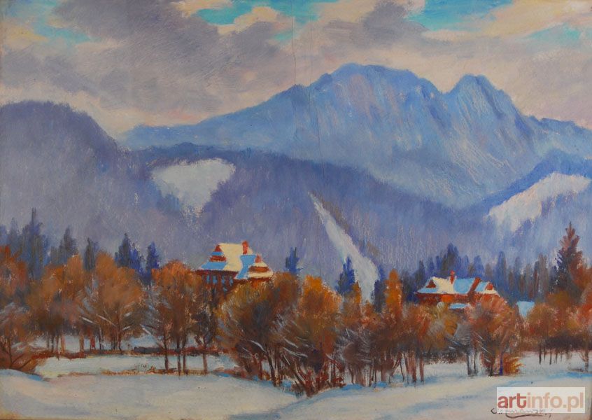 olej, tektura, 34 x 48 cm sygn.p.d.: St. Żurawski Na odwrocie autorski napis kredką: "St. Żurawski / Widok na Giewont w zimie".