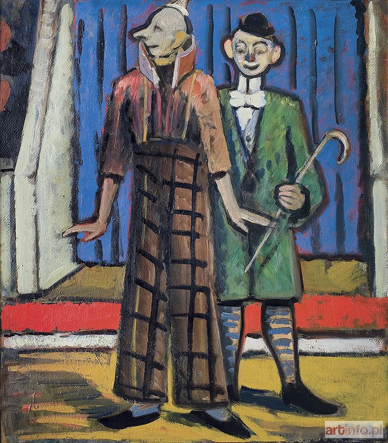 olej, tektura 70 x 68,5 cm sygn. p.d.: Tymon na górnej listwie krosna charakterystyczna autorska nalepka z tekstem: Tymon Niesiołowski | "Cyrkowcy" | olej | 70 x 60