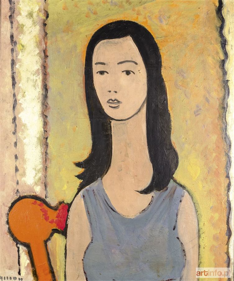 olej, płótno, 73 × 60 cm sygn. l. d.: Tymon na krośnie nalepka z napisem: Tymon Niesiołowski/Dziewczyna o czarnych włosach/73 × 60