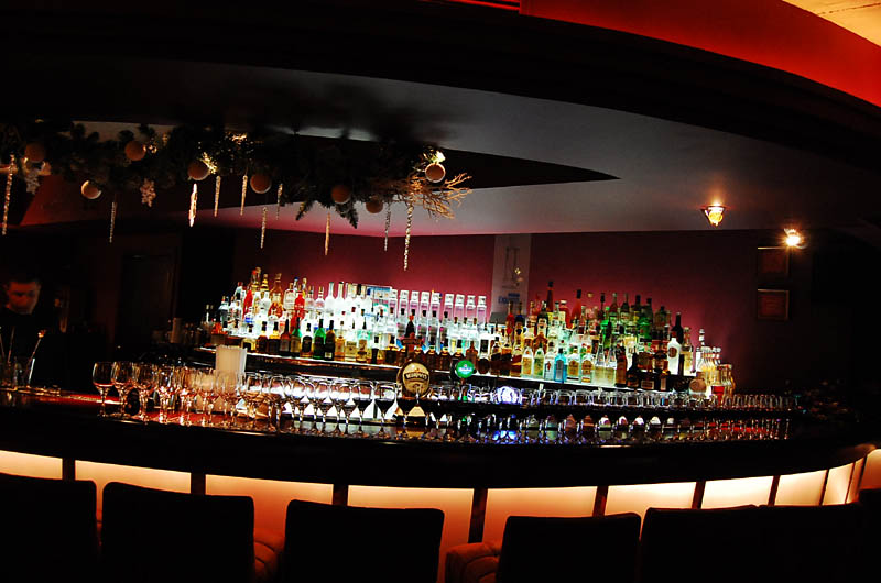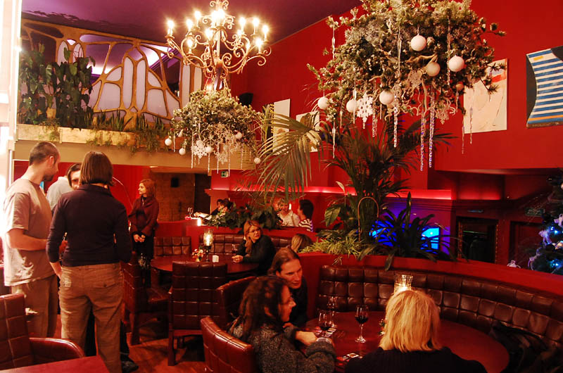 Klimat wnętrza lokalu nie nawiązuje do praskiego otoczenia, a przeciwnie - tworzy ekskluzywną oprawę, podkreśloną bogatą aranżacją, stawiającą na dekoracyjność i wygodę. Mimo takiego pomysłu na przestrzeń znalazło się tu odpowiednie miejsce na sztukę. Ogromna, pusta, pomalowana "muzealną" czerwienią ściana nad barem stanowi bardzo dobre passe-partout dla współczesnego malarstwa. To ona czyni 80 % przygotowanej wystawy, korespondując z niewielką ilością prac umieszczonych między filarami po przeciwnej stronie lokalu.